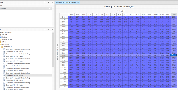 Diese Tabelle unten zeigt als Beispiel die gear map für den 5. Gang im Modus A (Performance). Die horizontale Achse zeigt die twist grip position und die vertikale Achse zeigt die RPM. Die hervorgehobene Zelle in der Abbildung unten, dass bei 100% geöffnetem Gasgriff bei 7.500 RPM (U/min) die tatsächlich angeforderte Drosselklappenstellung nur 74,14% beträgt. Im Gegensatz zu 100% Gasgrifföffnung wird also nicht die ganze Leistung freigegeben.
