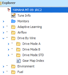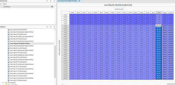 Sie können in den DBW-Tabellen dieses Motorrades für bestimmte Gänge ab einer bestimmten RPM / twist grip position (Drehzahl / Gasgriffposition) Einschränkungen sehen. Auf dieser Serienmap können sie sehen, dass das Motorrad in den oberen 2 Gängen selbst bei 100% wide open throttle (WOT) Gasgrifföffnung nicht wirklich 100% Öffnung an der Drosselklappe anfordert.