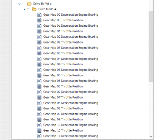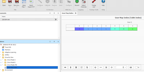 Wenn Ihnen die Änderungen, die sie an dieser speziellen gear map vorgenommen haben, gefallen (in diesem Fall gear map 05), können sie die Werte in dieser Tabelle kopieren und in andere gear map Tabellen wie 4. oder 6. einfügen. Oder einfach zum Gear Map Index zurückkehren und den 4., 5. und 6. Gang so einstellen dass die gear map 5 verwendet wird.