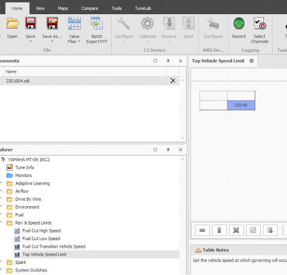 Das Bild unten zeigt die Geschwindigkeitsbegrenzungstabelle einer Yamaha MT-09 als Referenz, die auf 130,49 begrenzt ist (km/h wird standardmäßig bei europäischen Windows-Versionen angezeigt). Sie können auf diese Zahl klicken und den km/h-Wert nach Wunsch bearbeiten. Wenn sie den Begrenzer entfernen möchten, stellen Sie einfach die Zahl auf eine höhere Geschwindigkeit als das Fahrzeug erreichen kann ein. Im Grunde deaktivieren sie den Begrenzer dadurch vollständig (Beispiel:299 km/h)
